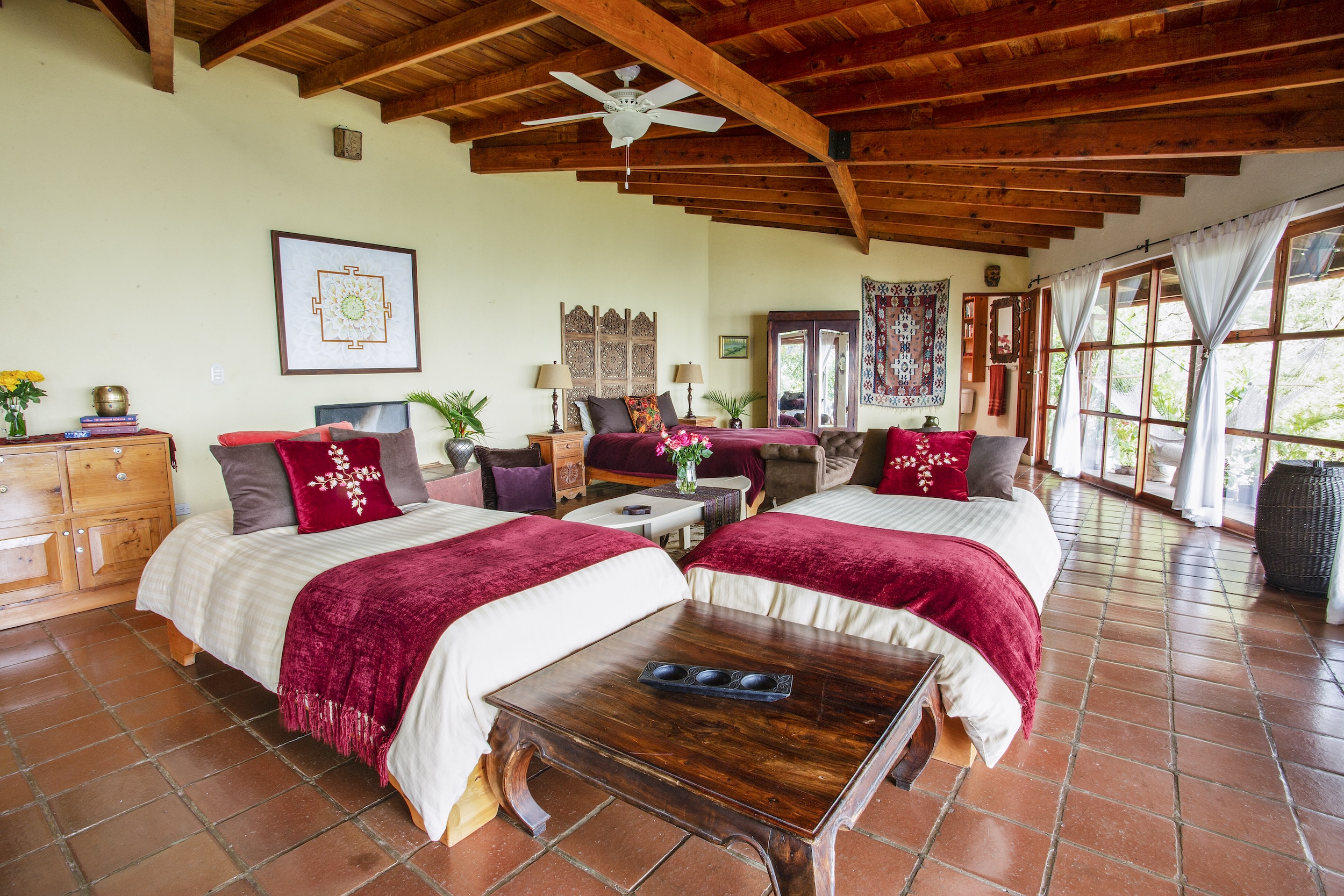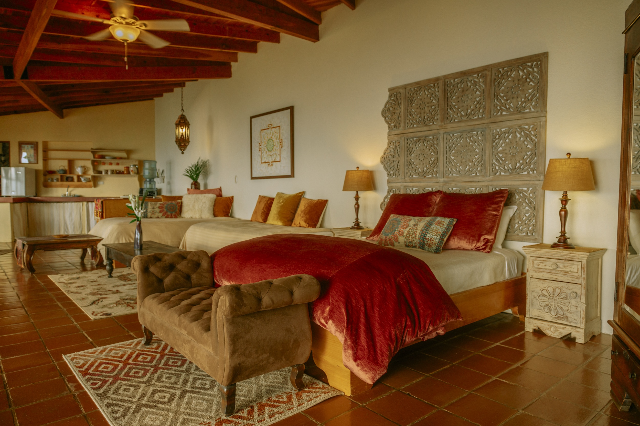 • Fixed bed configuration: King bed with an antique carved headboard